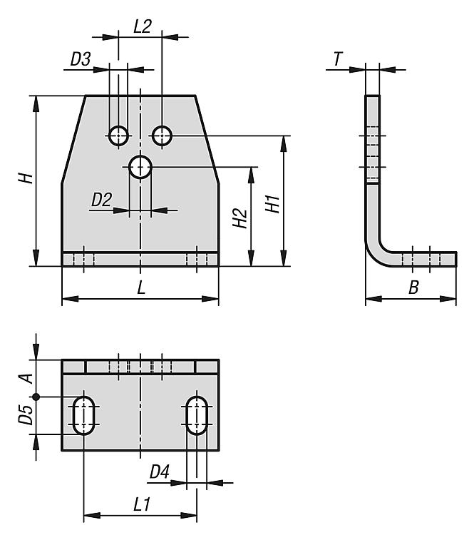 | 订货号 | 尺寸 | A | B | D2 | D3 | D4 | D5 | H | H1 | H2 | L | L1 | L2 | T | 适合夹紧元件的尺寸