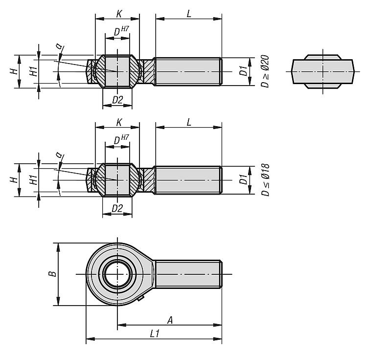 万向接头,带滑动轴承, 外螺纹,钢制,DIN ISO 12240-1 可重新润滑
