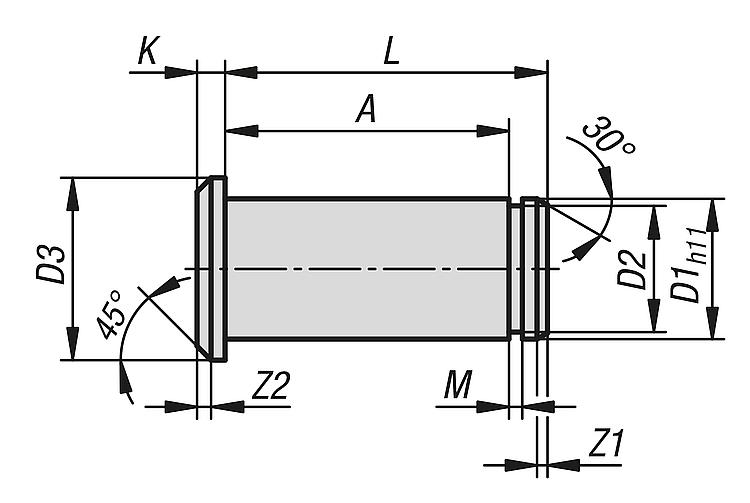 提示:带有环槽的销适用于 DIN 71752 标准的叉头。通过 DIN 471 标准的卡簧固定。