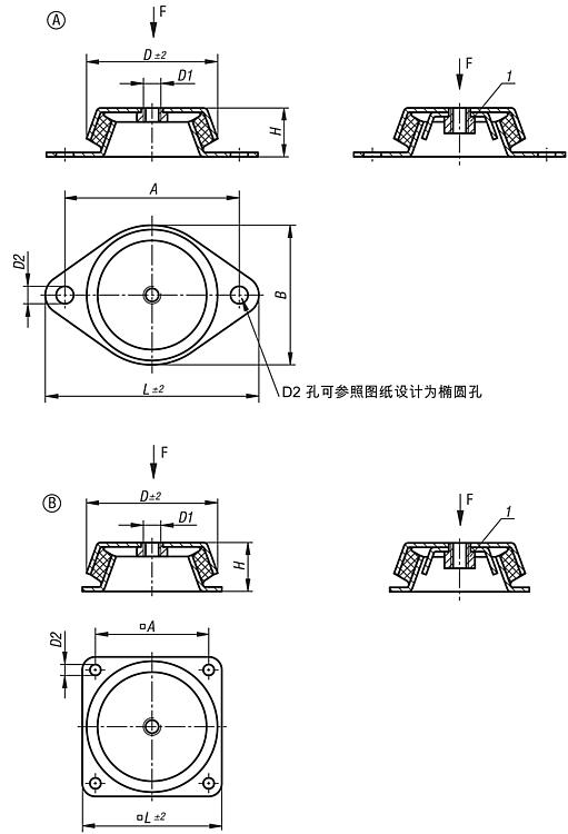 根据要求:橡胶硬度为 40° 或 70° Shore A 的机脚。图纸提示: