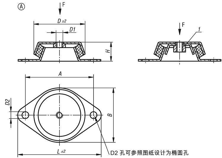 根据要求:橡胶硬度为 40° 或 70° Shore A 的机脚。图纸提示: