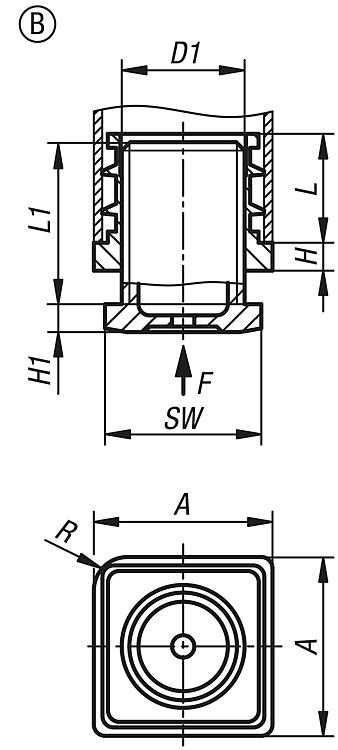 用于圆管和方管的无插件塑料调节插头,B 型,正方形