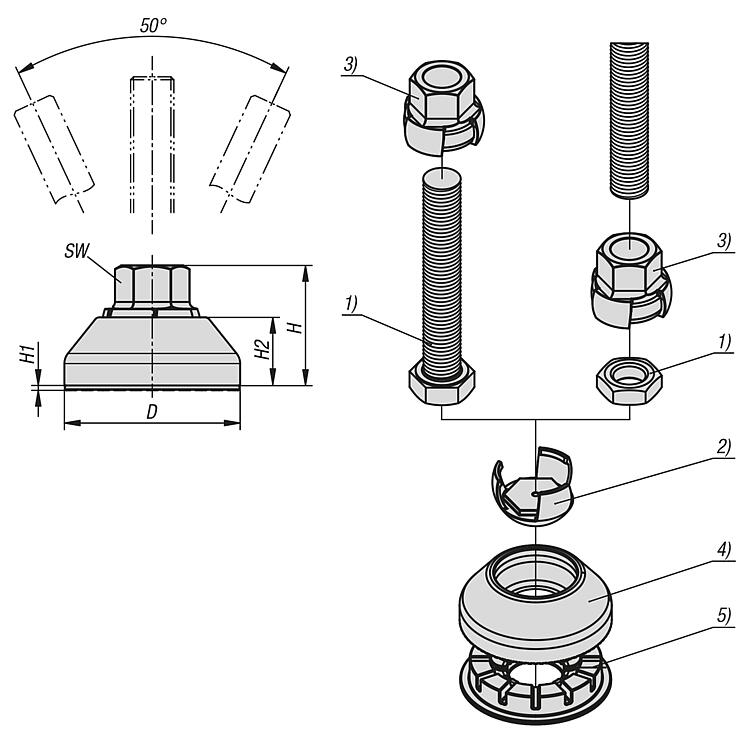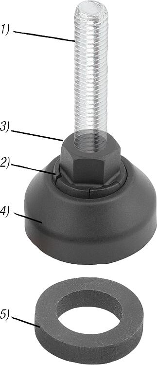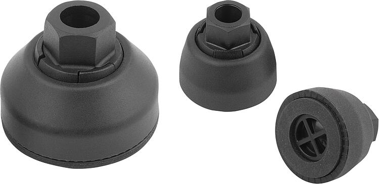 规格:黑色。提示:表中给出的负载值基于一系列实验得出,即静态负载垂直于主轴中心的脚杯。振动或其他振荡效果产生的轴向作用力会影响承载力,这种情况下不考虑指定值。装配:1. 将六角螺栓 (1) 或六角螺母 (1) 放入套筒 (2)。