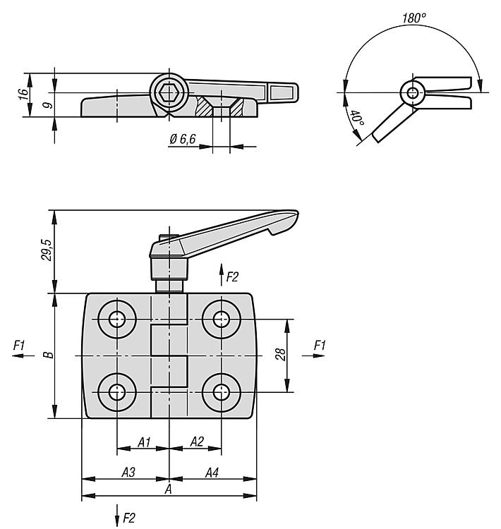 规格:黑色铰链。镀锌轴。黑色夹紧杆。黑色镀锌机械机构。提示:铰链可通过可松脱的锁紧手柄夹紧在任何位置。