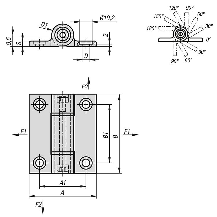 规格:黑色阳极氧化提示:铰链具备锁定功能。从 0° 到 270° 每隔 30° 啮合一次,并由此保持门和活盖敞开或牢固闭合。