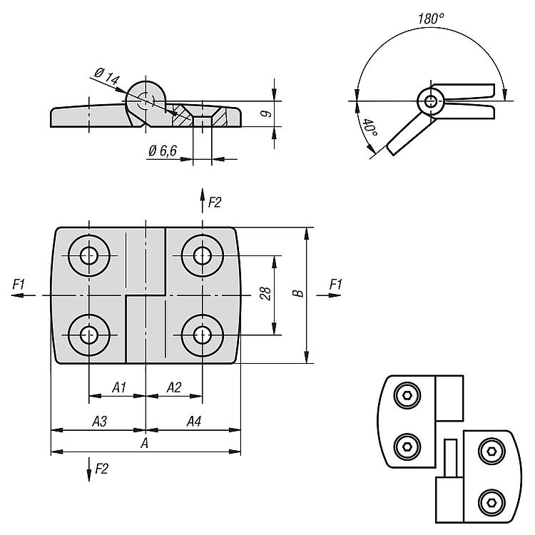 根据要求:带铝制型材导向块(开槽 5、6、8、10、12 和 14)铰链。