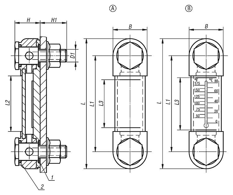 油位指示器既可以按照图纸所示安装,也可以直接在螺纹孔中安装。固定孔的轴心间距 = L1 ±0.3。