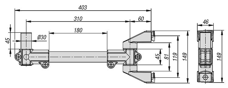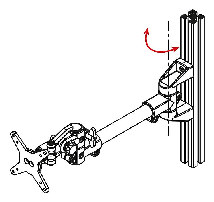 允许 60° 的转动范围。载荷达 10 kg(静态)。带通用安装板。基架适用于固定 Ø30 mm 的圆管。通过选配的变径轴套 29042 还可连接其他截面的管材(Ø20、25 mm 的圆管或 20 x 20 mm 的方管)。