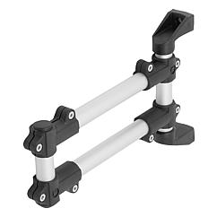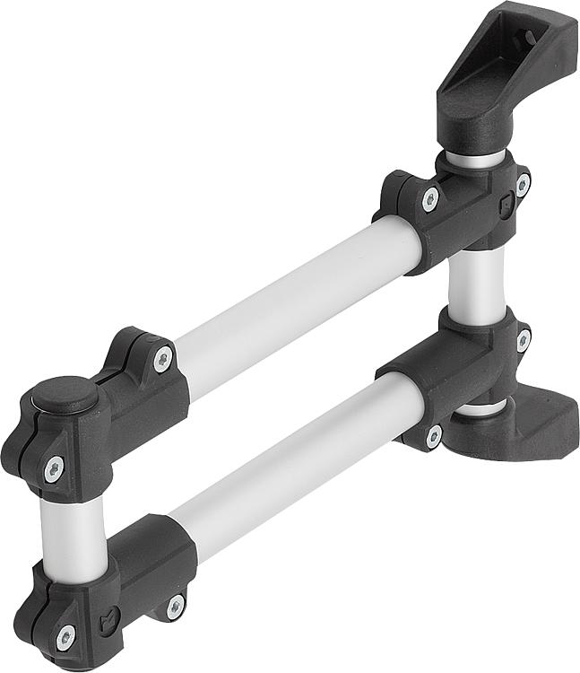 允许 60° 的转动范围。载荷达 10 kg(静态)。带通用安装板。基架适用于固定 Ø30 mm 的圆管。通过选配的变径轴套 29042 还可连接其他截面的管材(Ø20、25 mm 的圆管或 20 x 20 mm 的方管)。