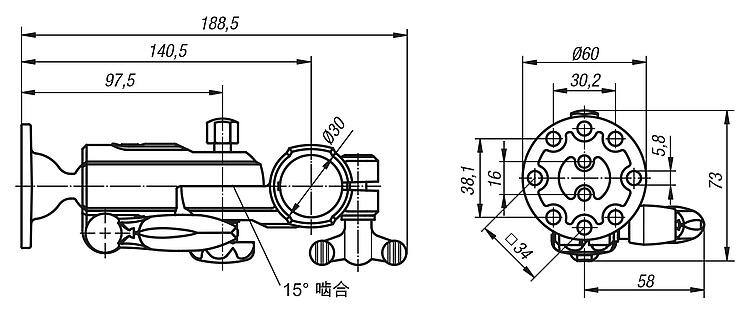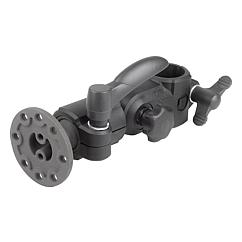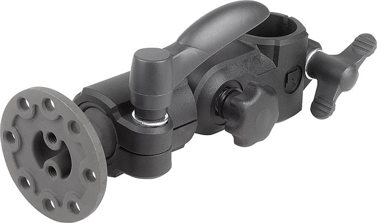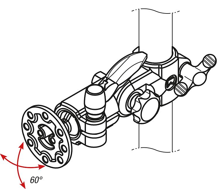 提示:允许 60° 的转动范围。用于最高 10kg(静态)重的负荷。带万用螺栓板。基架适用于在 Ø30 mm 的圆孔上固定。特点: