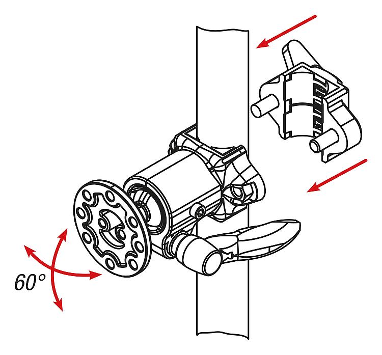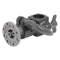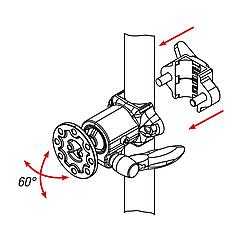 允许 60° 的转动范围。载荷达 10 kg(静态)。带通用安装板。基架适用于固定 Ø30 mm 的圆管。通过选配的变径轴套 29042 还可连接其他截面的管材(Ø20、25 mm 的圆管或 20 x 20 mm 的方管)。