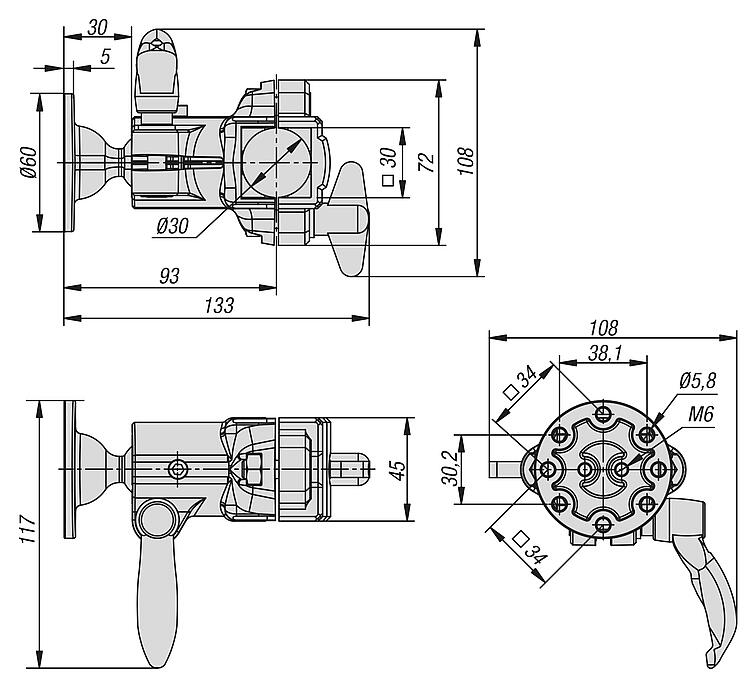 节省空间,允许旋转范围为 60°。载荷达 10 kg(静态)。带通用安装板。基架适用于固定 Ø30 mm 的圆管或 30 x 30 mm 的方管。通过选配的变径轴套 29040 还可连接其他截面的管材(Ø20、25 mm 的圆管或 20 x 20、25 x 25 mm 的方管)。