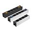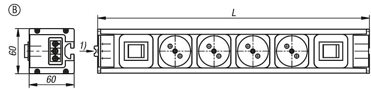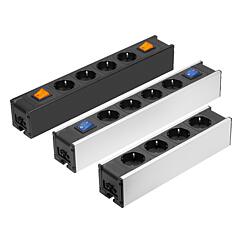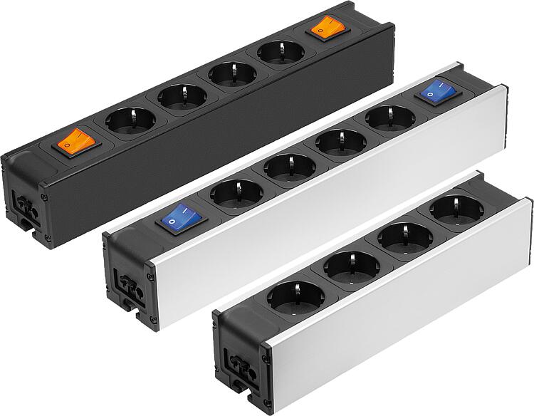 电源插线板具有电源输入端和电源输出端。其集成在前侧端盖中,根据版本的不同,可以通过一个发光的开启/关闭开关进行切换。通过单独提供的电源线连接到电源。通过使用连接联轴器或连接电缆,可直接或远距离连接多个电源插线板(最多连接 6 个电源插线板,电源和连接电缆最长为 8 m。最大连接负载 3500 W)。额外的电源插线板或 LED 灯可连接到电源输出端。