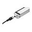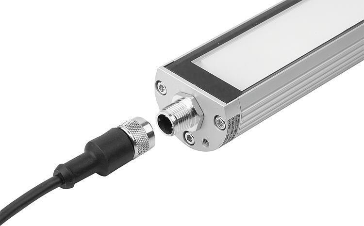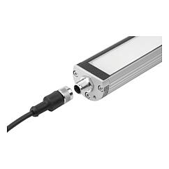 这款 LED 的灯具的电源输入端带有一个 M12 连接器。连接器集成在端盖的正面。电源接口通过 M12x1 连接器(3 到 5 针)进行连接。