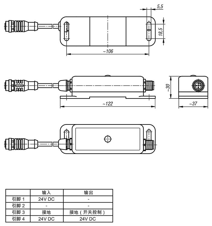 输入端:M12x1 A 编码连接器(3 针插头)。 输出端:带有 M12x1 A 编码连接器的 150 mm 线缆(3 针插座)。