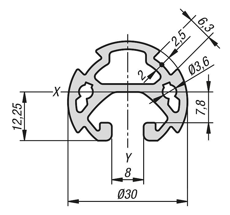 产品说明材料:铝制 EN AW-6063 T66 (AlMgSi0.5 F25)。规格:高温时效,自然色阳极氧化。提示:轻质铝型材,用于重量优化和超薄结构。Ø30 型材连接器可以连接到三个夹紧槽,每个夹紧槽呈 90° 角,无需进一步加工。正连接导致极其稳定的结构。连接可以随时扩展,也可以轻松拆卸。