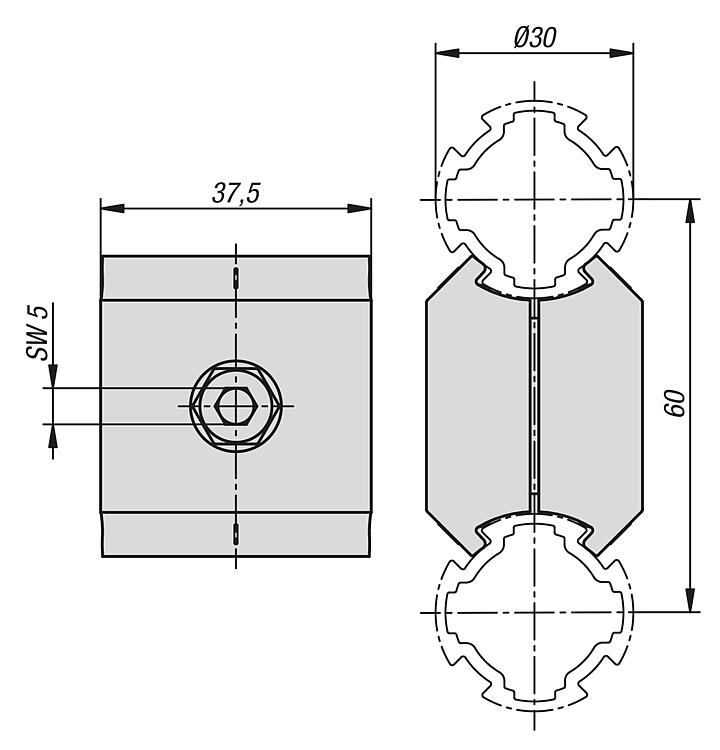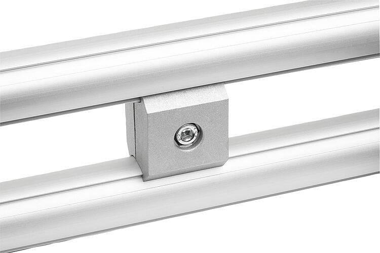 对于并联。预装配的平行连接器可以直接定位并拧紧在 Ø30 型材管上。由于连接器有两个半部,平行连接器也可以改装到现有结构上以加强或扩展它们。供货范围2 个平行连接器的一半。 1 个螺钉 DIN EN ISO 4762 (DIN 912) - M6 x 20,镀锌。 1 个自锁螺母 ISO 10511 - M6,镀锌。