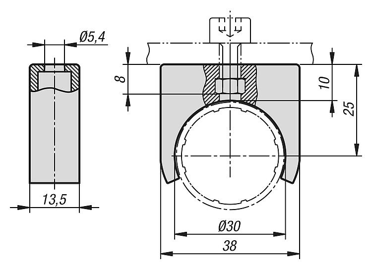 产品说明材料:塑料 PA,玻璃珠增强。规格:类似于 RAL 7042 的灰色。提示:用于将光表面元件或任何组件紧固到外径为 30 mm 的圆管和型材管上。