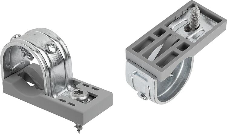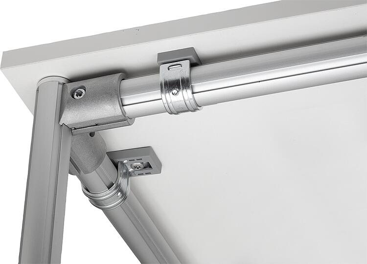 坚固的固定元件,用于固定由刨花板或复合板制成的桌面。重型钢夹用螺钉固定在型材管上,从而确保牢固固定。桌面用随附的木螺丝固定。