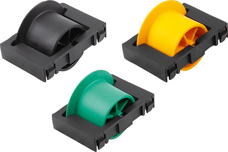 产品说明材料:玻璃珠增强型聚酰胺材质的辊轮和外壳。钢制轴。规格:黑色外壳。提供各种颜色的辊轮。提示:滚子元件与辊轮导轨的铝制型材相匹配,并且可快速、简便地安装其上。无需工具即可完成型材的安装。适用于 B 型和 I 型铝制型材。特点: