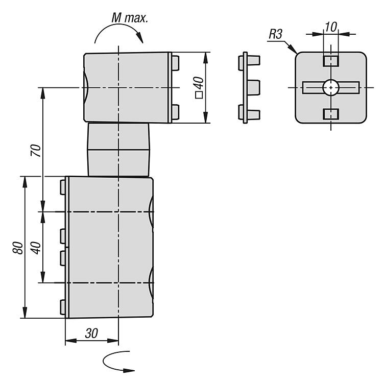 提示:摩擦接头,用于使用铝制型材制造单个旋转臂。摩擦接头的特点是摩擦扭矩固定,从 0.5 至 15 Nm,分为 6 个层级。可 360° 旋转。槽间距 40 mm。