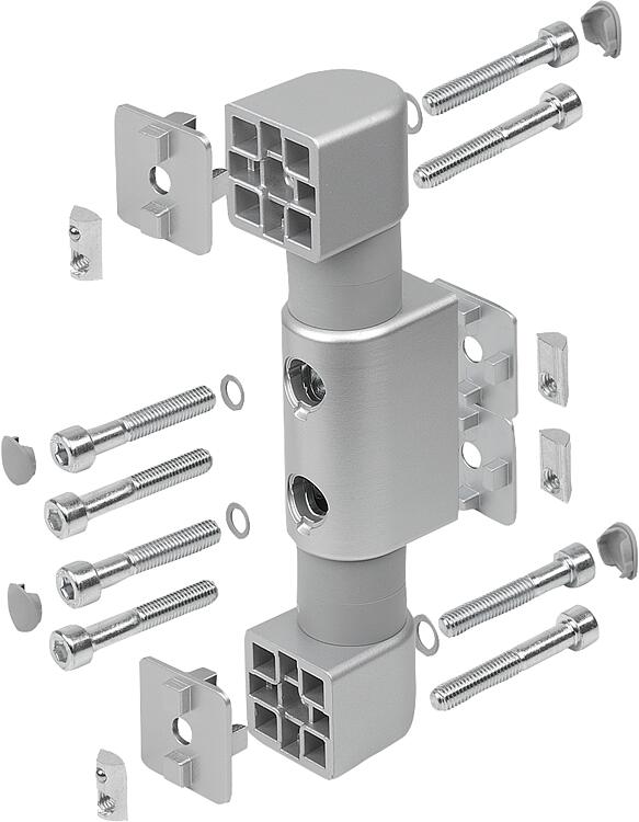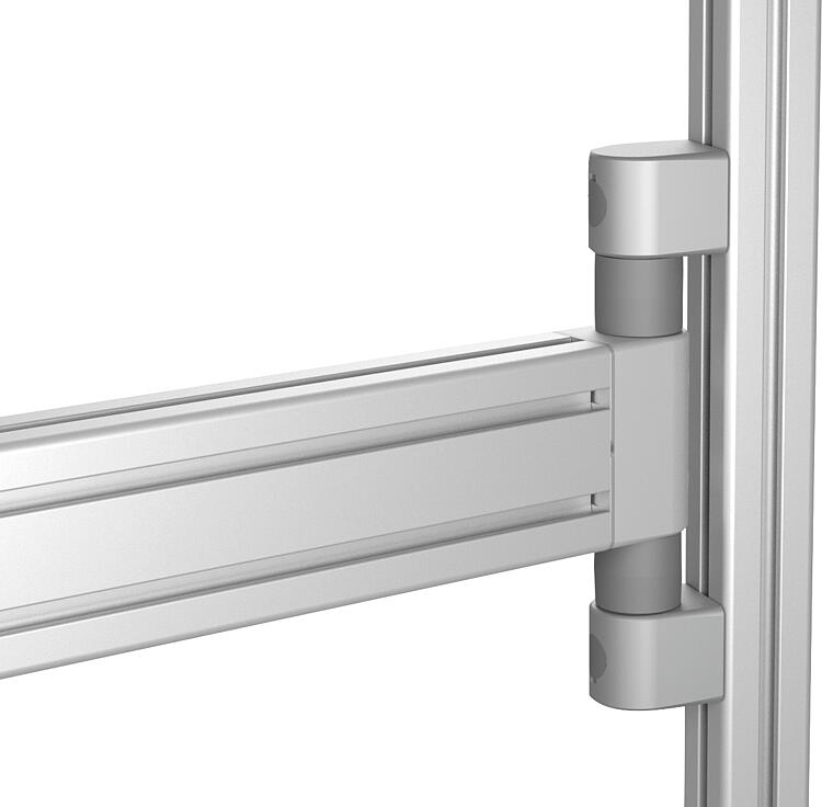 摩擦接头可纵向、横向或在正面连接到型材上。正面安装时,芯孔中必须有一个 M8 螺纹(深度最小值为 15 mm)。在平面上安装时,只需省去随附的型槽固定板即可。