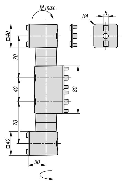 提示:摩擦接头,用于使用铝制型材制造单个旋转臂。摩擦接头的特点是摩擦扭矩固定,从 0.5 至 15 Nm,分为 6 个层级。可 360° 旋转。槽间距 40 mm。