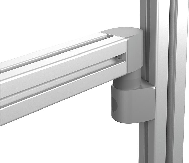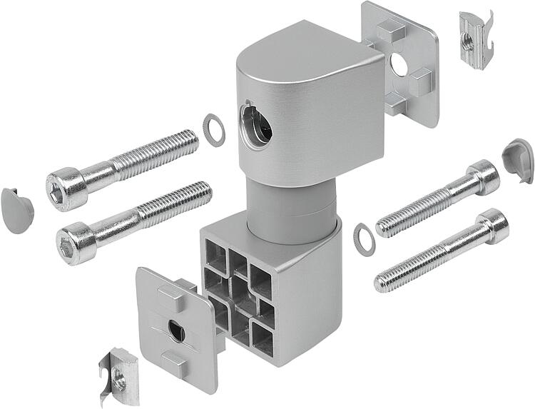 摩擦接头可纵向、横向或在正面连接到型材上。正面安装时,芯孔中必须有一个 M8 螺纹(深度最小值为 15 mm)。在平面上安装时,只需省去随附的型槽固定板即可。