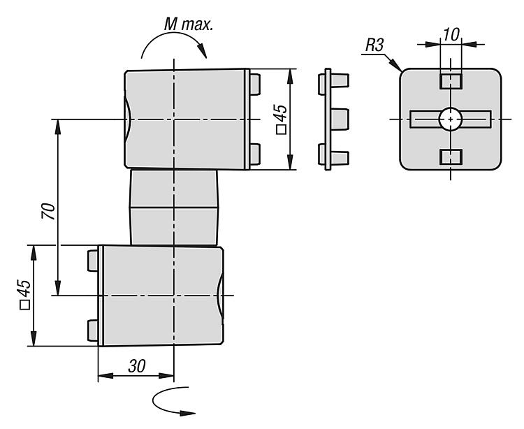 提示:摩擦接头,用于使用铝制型材制造单个旋转臂。摩擦接头的特点是摩擦扭矩固定,从 0.5 至 15 Nm,分为 6 个层级。可 360° 旋转。槽间距 40 mm。