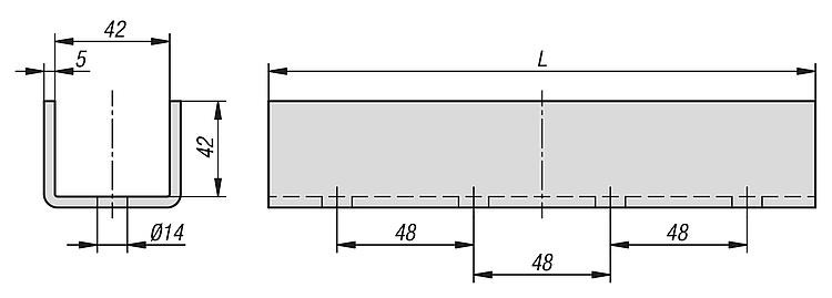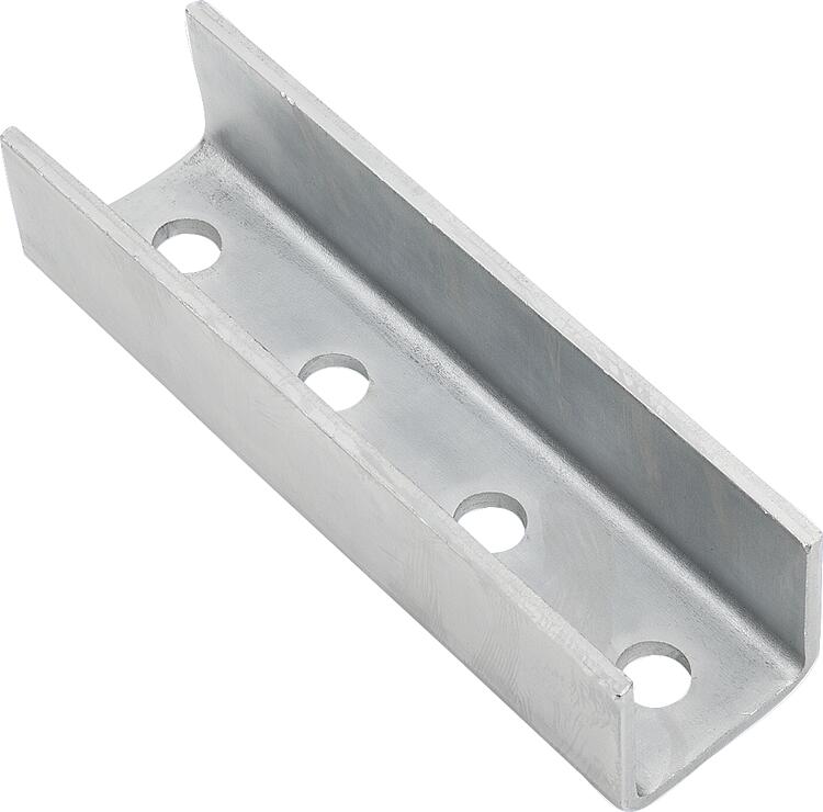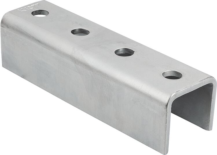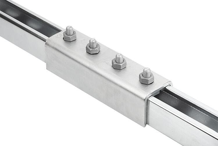 导轨连接器可使导轨彼此精确对齐。4 个孔与安装导轨上的长孔相匹配。 使用六角螺栓、垫圈和螺母(需单独订购螺栓、垫圈和螺母)进行推入式安装的强制连接。