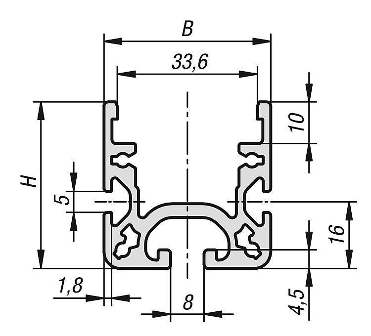 | 订货号 | 槽宽 | 型材 | B | H | L | Ix cm⁴ | Iy cm⁴ | Wx cm³ | Wy cm³ | 剖面区 cm² | 重量 约 kg/m