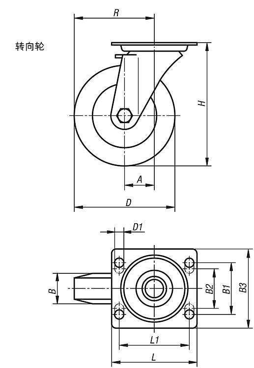 带实心橡胶轮胎钢板转向轮,标准型
