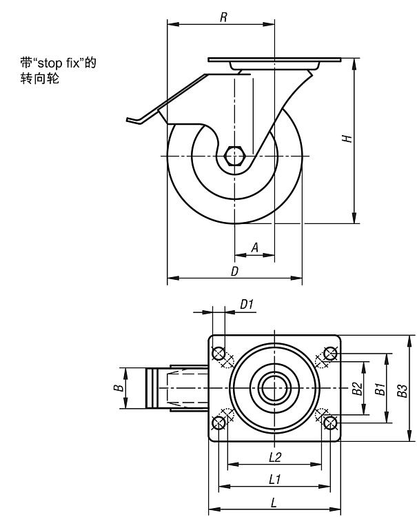 带“stop fix”钢板转向轮,导电,带橡胶胎面,标准型