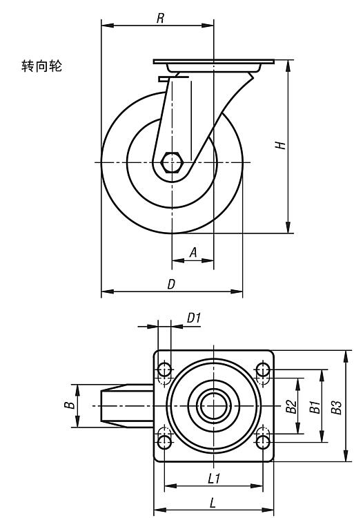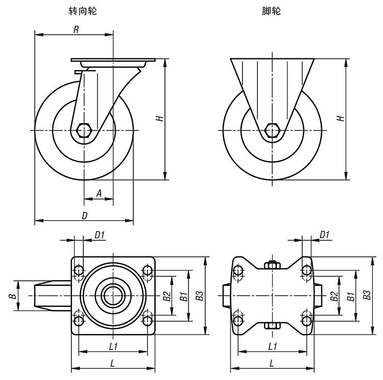 产品说明材料:钢板制壳体,带预先硫化弹性实心橡胶轮胎的聚酰胺 6 制轮体。规格:压制壳体。带双球轴承(转动环中)和球保护装置的转向轮壳体。带滚子轴承的车轮。提示:用螺栓固定的轮轴。抗撞击和抗冲击车轮。