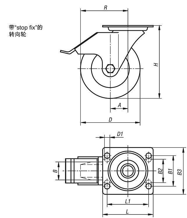 带“stop fix”和硫化弹性实心橡胶轮胎的钢板转向轮,标准型