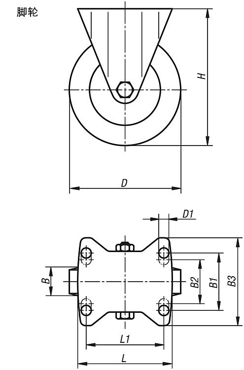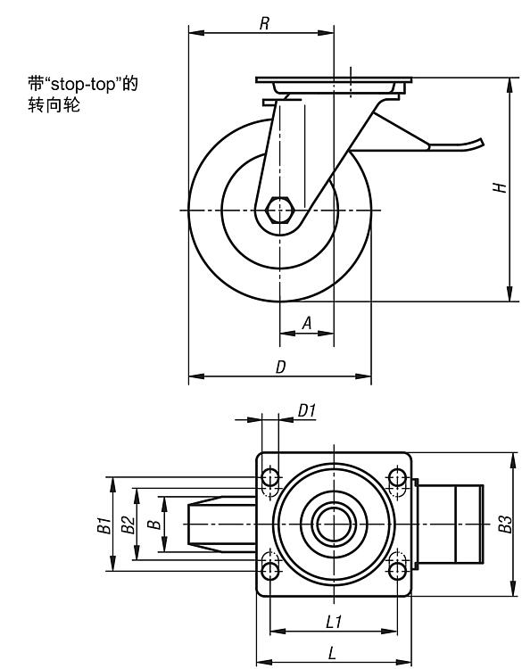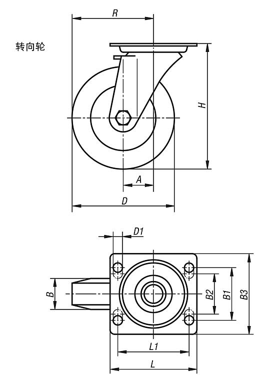 压制壳体。加固叉,底板和中间螺栓。带双球轴承(转动环中)的转向轮壳体,带经硬化处理的轴瓦。带精密滚珠轴承的车轮。