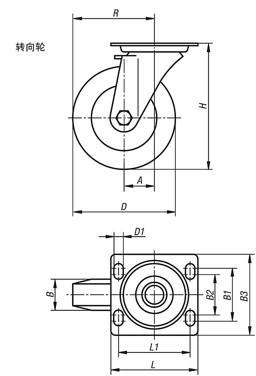压制壳体。带重型叉和底板的转向轮壳体,用极为稳定的中间螺栓拧紧并固定。转动环用经过特殊成型和硬化处理的轴瓦进行额外加固。