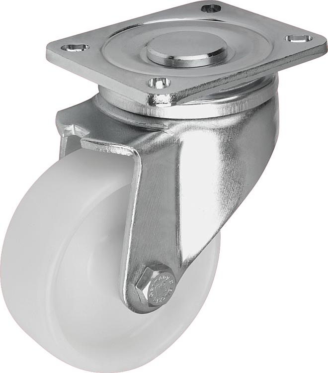 压制壳体。带重型叉和底板的转向轮壳体,用极为稳定的中间螺栓拧紧并固定。转动环用经过特殊成型和硬化处理的轴瓦进行额外加固。带滑动轴承的车轮。