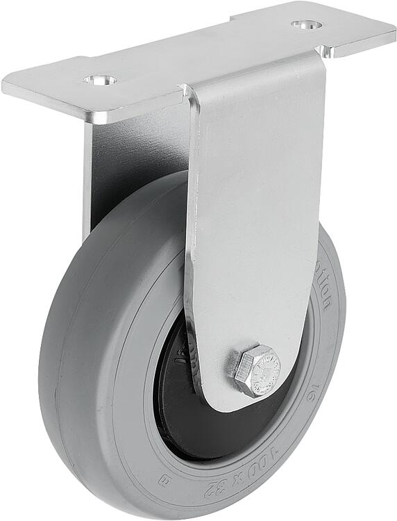 产品说明材料:钢板制壳体。 弹性实心橡胶制轮胎。 轮体采用尼龙 6。规格:电镀锌和经过蓝色钝化处理的钢板,不含 Cr6。 灰色弹性实心橡胶。 黑色尼龙 6。提示:通过两块专门开发的固定板,几乎可以保证对任何铝制型材的通用适应性。标准系列包括各种滚轮,如脚轮或带制动器和不带制动器的转向轮。 滚轮对许多腐蚀性介质具有很高的耐化学性。 胎面由硬度为 55° Shore A 的优质弹性实心橡胶制成。其硫化在尼龙轮体上。得益于优质橡胶混合物,胎面具有较低的滚动和旋转阻力。得益于厚实的胎面衬垫,滚轮对地面十分友好,而且还能吸音。应用:胎面由弹性实心橡胶制成的滚轮主要用于对运输货物的阻尼至关重要的场合,例如运输瓷砖或陶瓷,以及敏感的电子测量设备。温度范围:-20°C - +80°C特点: 下载此处为收集信息的 PDF: