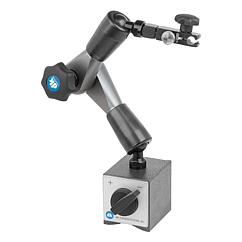 测量支架由经打磨后可切换的永久磁铁、棱形底座和扁平精密的后部、带中央机械夹紧装置的夹紧接头(用于单手操作)和精细或微调的量表夹组成。