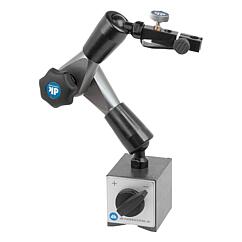 测量支架由经打磨后可切换的永久磁铁、棱形底座和扁平精密的后部、带中央机械夹紧装置的夹紧接头(用于单手操作)和精细或微调的量表夹组成。