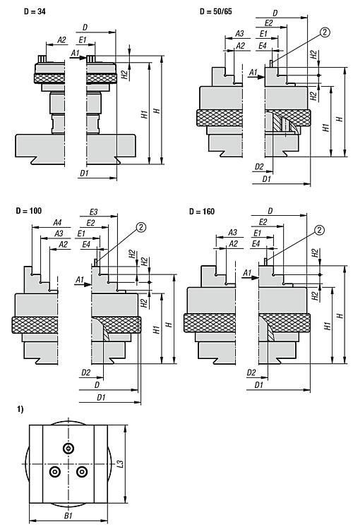 爪式夹盘 D=34 无操作工具。 爪式夹盘 D=50 带有操作工具,带有三个长度分别为 12 和 18 mm 的销钉 (Ø 2 mm)。 爪式夹盘 D=65 带有操作工具,带有三个长度分别为 12 和 18 mm 的销钉 (Ø 2 mm)。 爪式夹盘 D=100 带有操作工具,带有三个长度分别为 12、18 和 24 mm 的销钉 (Ø 3 mm)。 爪式夹盘 D=160 带有操作工具,带有三个长度分别为 18 和 24 mm 的销钉 (Ø 4 mm)。