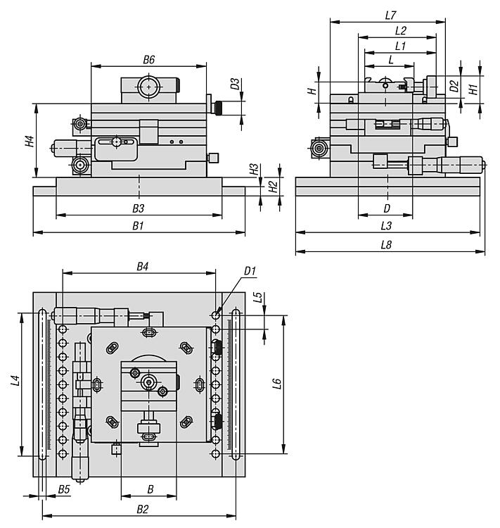 产品说明材料:铝制基体。 不锈钢元件。规格:硬质涂层主体。 亮色元件。提示:定位台可在 X 和 Y 方向无级调节。可以在孔 D1 中插入导杆,使其与机床工作台的 T 型槽相啮合(图 1.1)。这样就可以沿着测量轴进行精确移动。定位台可以在没有销钉的情况下旋转(图 1.2),并且仍然可通过长孔有效固定。定位台也可用于没有 T 型槽的机床工作台上,由于其自重较大,可根据需要进行调整和旋转(图 1.3)。