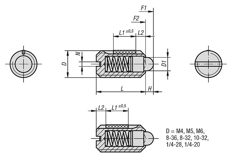 带一字槽和止动顶销的弹簧柱塞,钢制,标准弹簧弹力,带螺纹锁 - inch