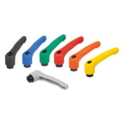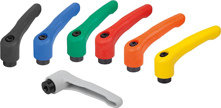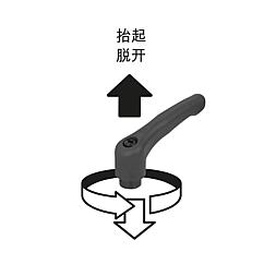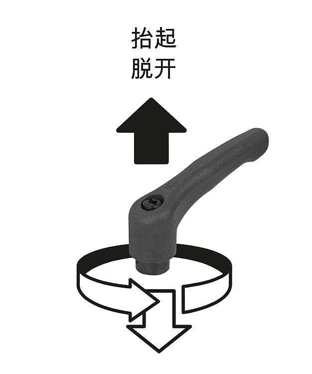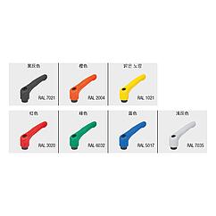 产品说明产品描述:把手设计(符合人体工学)中的塑料锁紧手柄呈现出高品质、新式的外观和令人愉悦的感受。 把手由一种特殊的高性能塑料制成,有多种标准颜色可供选择。 此款把手的优点是高钢度和高强度。其自身重量较轻,是移动应用的理想选择。材料:高性能热塑性塑料,玻璃纤维增强型。 强度等级为 5.8 的钢制部件。 规格:钢制部件经黑色氧化。使用说明:把手在未受控制的状态下通过一个齿圈卡入齿形芯中,以这种方式来紧固或松解螺纹。抬起把手可将其换入位置并通过弹簧弹力重新卡入齿圈。应用:机械、仪器和设备制造,康复区。温度范围:持续工作温度最高为 100 ℃。 短时工作温度最高为 130 ℃。优点:七种颜色类型。根据要求:其他内螺纹和特殊类型。 尺寸“H1”可按照需要提供其他长度,但需另行支付费用。