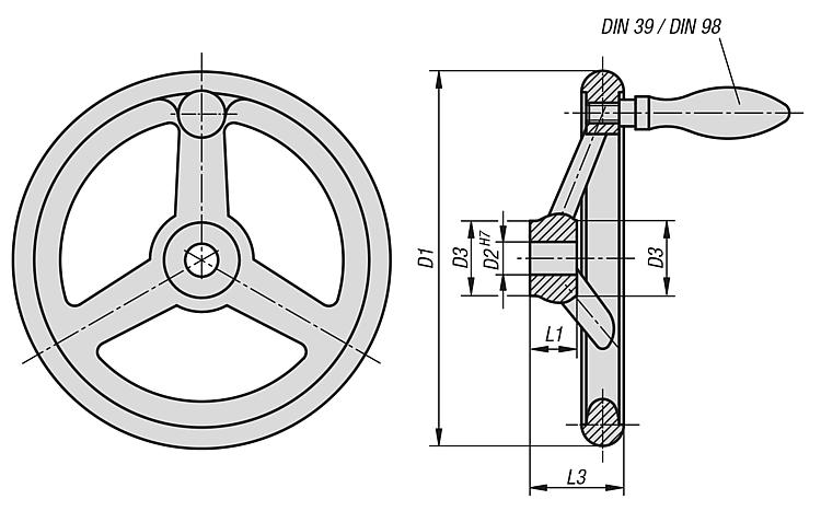 | 订货号 | D1 | D2 | D3≈ | L1 | L3 | 辐条 数 | 固定 手柄 DIN 39 E 型 | CAD | 配件 | 价格 | 订购 |