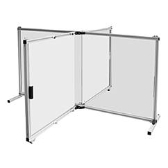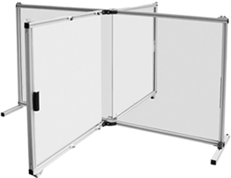 由实心铝制型材、铰链和丙烯酸玻璃板组成的高品质解决方案。实用性折叠系统——大会和会议的理想之选。 适合2-4人会议的系统。 通过可扩展板可调节旋转侧的长度。 坚固的设计。